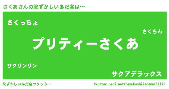 | 意味不明あだ名 | 『ペロリンさくあ』『さくあフォーエバー』 |