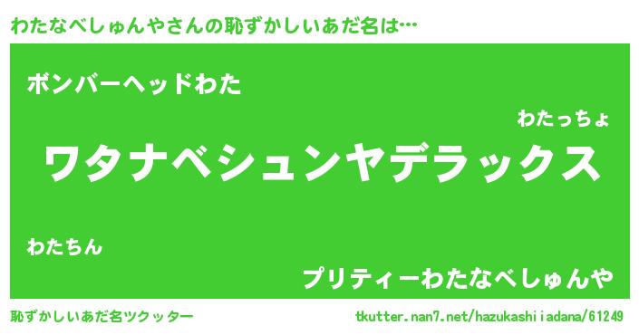 | 男性向けラノベタイトル風あだ名 | 『わたなべしゅんや~年齢イコール彼女いない歴の魔法使い~』 |