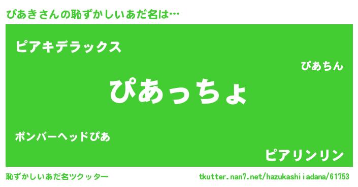 | 意味不明あだ名 | 『ぴあきフォーエバー』『自称ぴあき』 |