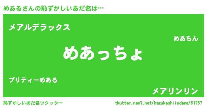 | ヒーロー風カッコイイあだ名 | 『ウルトラめあるマン』『魔戒騎士メア』 |