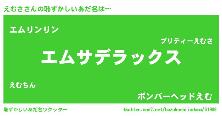 | 女子向けラノベタイトル風あだ名 | 『闇のえむさ』『えむさの卵を拾いまして』 |