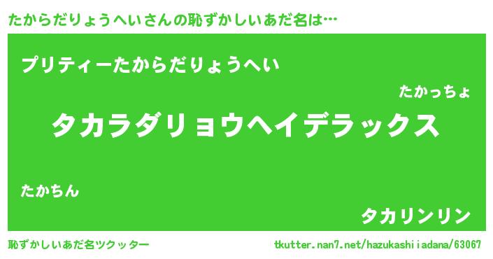 | 男性向けラノベタイトル風あだ名 | 『Re:たからだりょうへいから始める異世界生活』 |