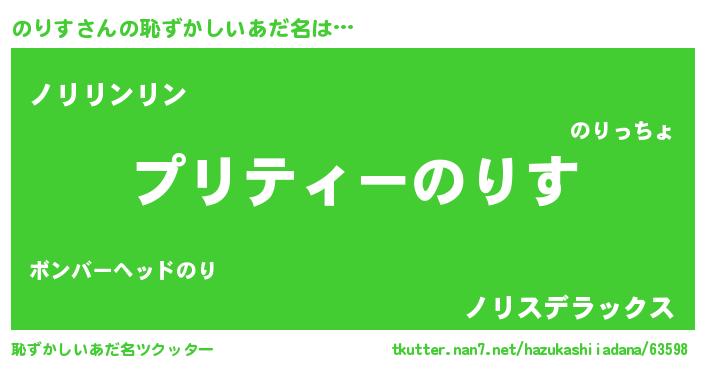 のりすさんの恥ずかしいあだ名は… 『プリティーのりす』『ノリリンリン』『ノリスデラックス』 ツクッター #恥ずかしいあだ名ツクッター http://tkutter.nan7.net/hazukashiiadana/63598/