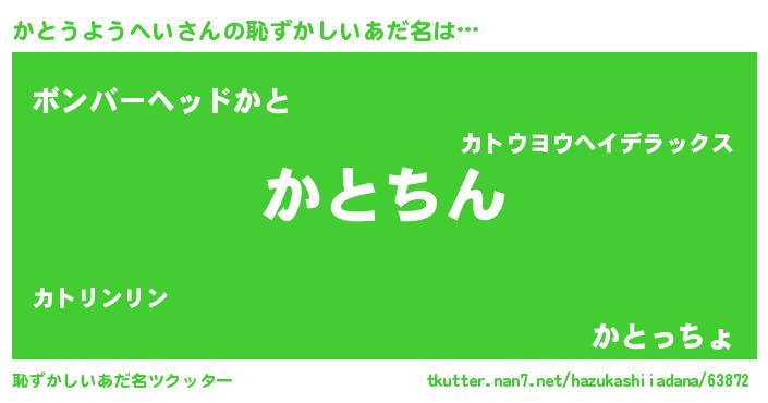 | ヒーロー風カッコイイあだ名 | 『ネオカトウヨウヘイ』『銀牙騎士カト』 |