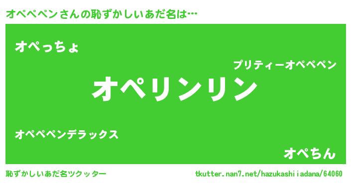 | 男性向けラノベタイトル風あだ名 | 『オペペペンの嫁は女の子じゃないと思った?』 |