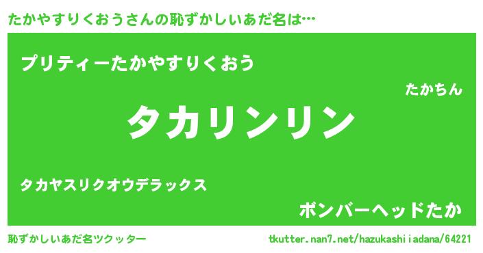 | 男性向けラノベタイトル風あだ名 | 『たかやすりくおうの嫁は女の子じゃないと思った?』 |