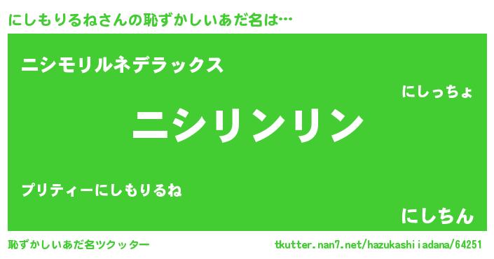 | 男性向けラノベタイトル風あだ名 | 『ダンジョンににしもりるねを求めるのは間違っているだろうか』 |