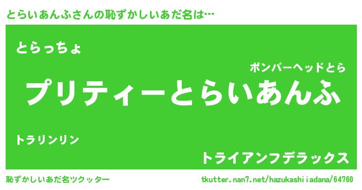 | 肩書あだ名 | 『とらいあんふCEO』『とらいあんふ船長』 |
