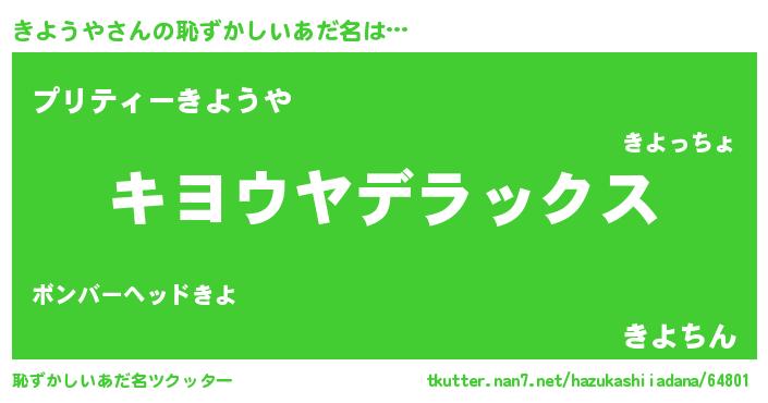 | 男性向けラノベタイトル風あだ名 | 『Re:きようやから始める異世界生活』 |