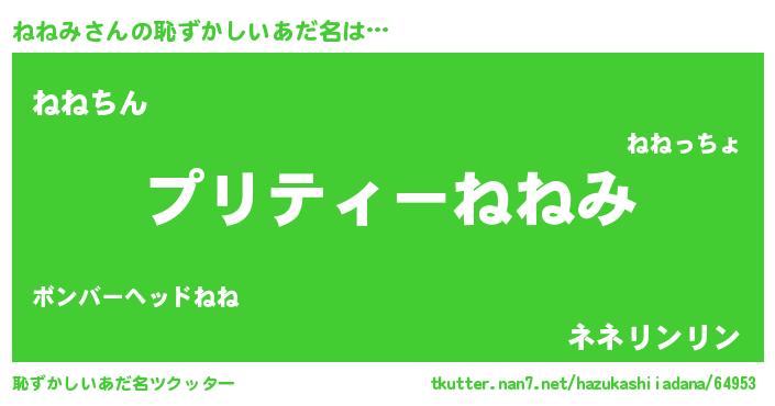 | 男性向けラノベタイトル風あだ名 | 『ねねみ~年齢イコール彼女いない歴の魔法使い~』 |