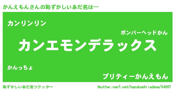 | 男性向けラノベタイトル風あだ名 | 『Re:かんえもんから始める異世界生活』 |