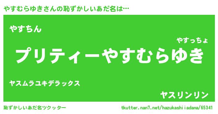 | 男性向けラノベタイトル風あだ名 | 『やすむらゆき~年齢イコール彼女いない歴の魔法使い~』 |