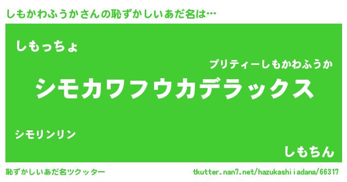 | 男性向けラノベタイトル風あだ名 | 『転生したらしもかわふうかだった件』 |