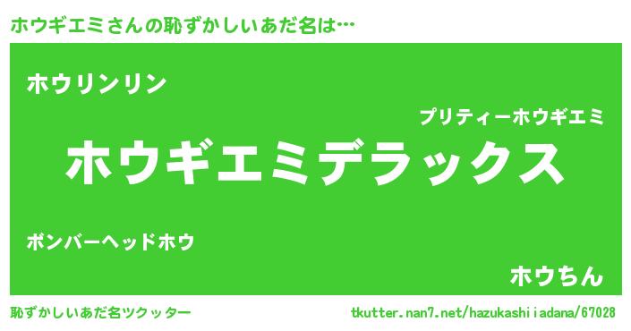 | 男性向けラノベタイトル風あだ名 | 『Re:ホウギエミから始める異世界生活』 |