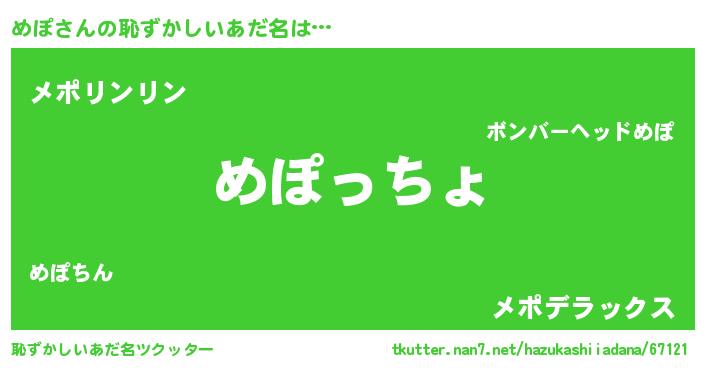 | 女子向けラノベタイトル風あだ名 | 『めぽの雑貨屋さん』『死神めぽの再婚』 |