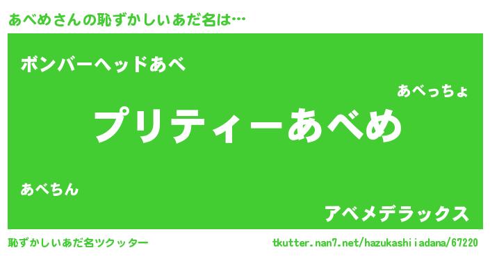| 男性向けラノベタイトル風あだ名 | 『魔弾の王とあべめ』『あべめの憂鬱』 |
