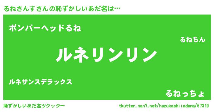 | 男性向けラノベタイトル風あだ名 | 『るねさんすの嫁は女の子じゃないと思った?』 |