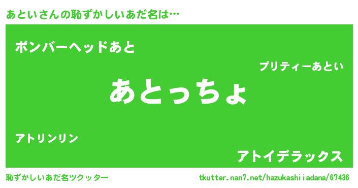 | 意味不明あだ名 | 『あといフォーエバー』『自称あとい』 |