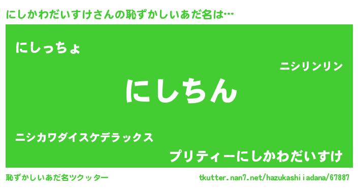 | 男性向けラノベタイトル風あだ名 | 『この素晴らしい世界ににしかわだいすけを!』 |