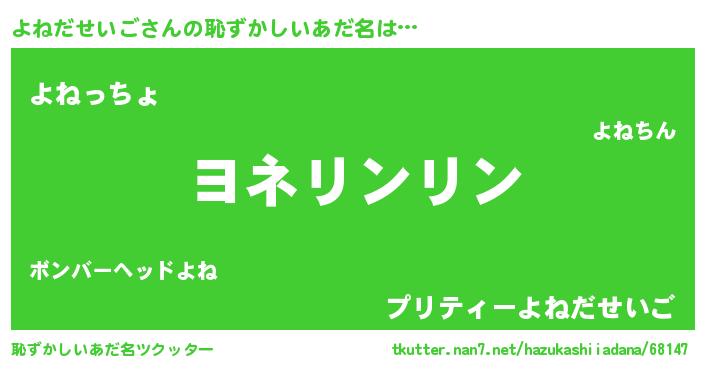| 男性向けラノベタイトル風あだ名 | 『うちのよねだせいごが世界を掌握している!』 |