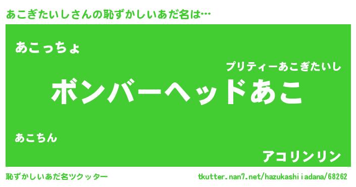 | 男性向けラノベタイトル風あだ名 | 『おまえをオタクにしてやるから、俺をあこぎたいしにしてくれ! 』 |