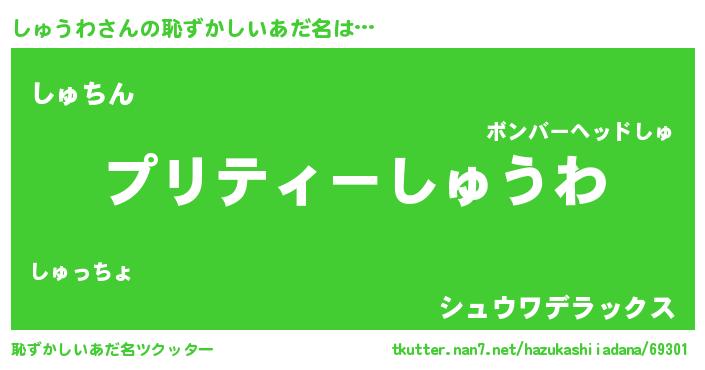 | 意味不明あだ名 | 『ペロリンしゅうわ』『永久保存しゅうわ』 |