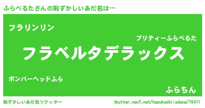 | 意味不明あだ名 | 『自称ふらべるた』『永久保存ふらべるた』 |