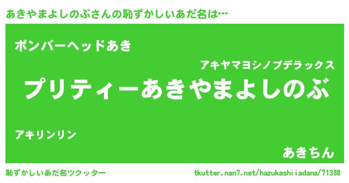 | 男性向けラノベタイトル風あだ名 | 『あきやまよしのぶに滅ぼされるだけの簡単なお仕事です』 |