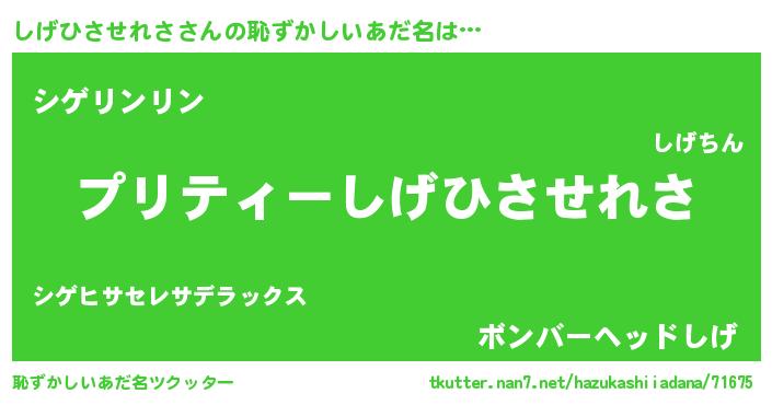 | 男性向けラノベタイトル風あだ名 | 『魔弾の王としげひさせれさ』 |