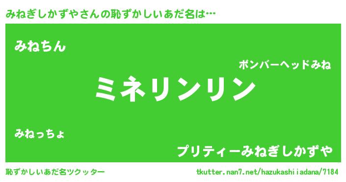 | 男性向けラノベタイトル風あだ名 | 『みねぎしかずやの嫁は女の子じゃないと思った?』 |