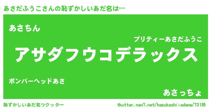 | 男性向けラノベタイトル風あだ名 | 『あさだふうこ~年齢イコール彼女いない歴の魔法使い~』 |