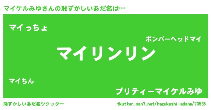 | 男性向けラノベタイトル風あだ名 | 『マイケルみゆの嫁は女の子じゃないと思った?』 |