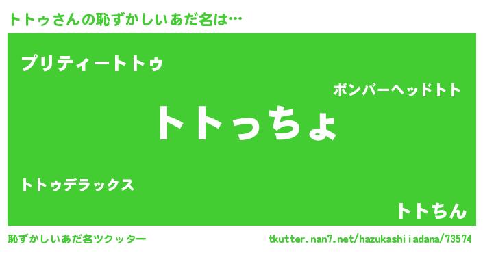 | 女子向けラノベタイトル風あだ名 | 『トトゥ伯爵の花嫁』『トトゥ恋絵巻』 |