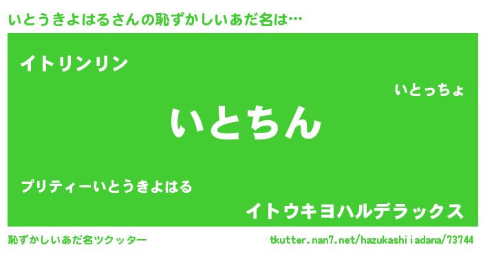 | 男性向けラノベタイトル風あだ名 | 『いとうきよはる~年齢イコール彼女いない歴の魔法使い~』 |