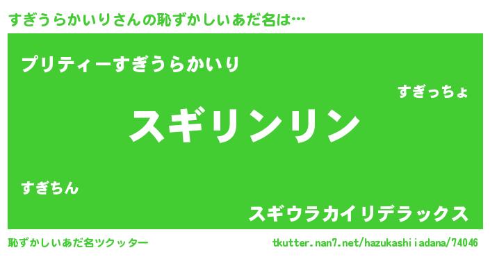 | 男性向けラノベタイトル風あだ名 | 『すぎうらかいりの嫁は女の子じゃないと思った?』 |