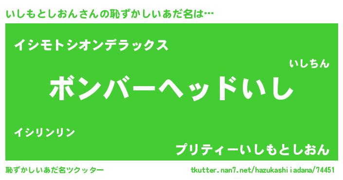 | 男性向けラノベタイトル風あだ名 | 『おまえをオタクにしてやるから、俺をいしもとしおんにしてくれ! 』 |