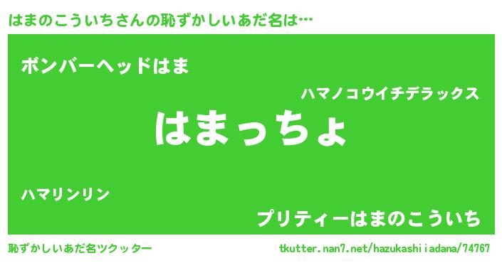 | 男性向けラノベタイトル風あだ名 | 『はまのこういち~年齢イコール彼女いない歴の魔法使い~』 |