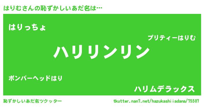 | 男性向けラノベタイトル風あだ名 | 『はりむの嫁は女の子じゃないと思った?』 |