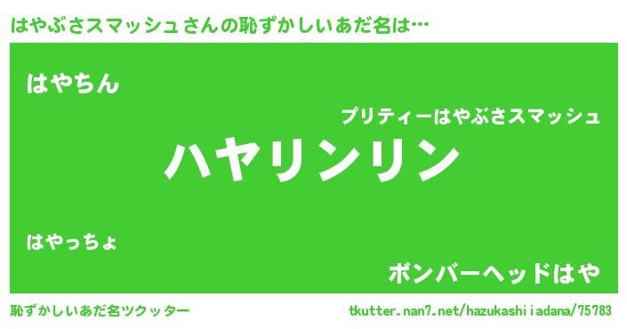 | 男性向けラノベタイトル風あだ名 | 『はやぶさスマッシュの嫁は女の子じゃないと思った?』 |