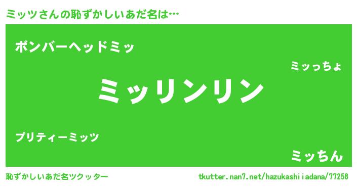 | ヘコむあだ名 | 『ミッぷりん』『ミッツ(苦笑)』 |
