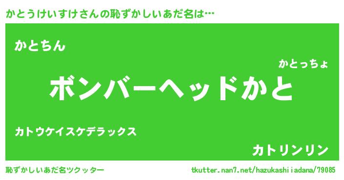 | ヘコむあだ名 | 『かとうけいすけ(爆)』『かと太郎』 |