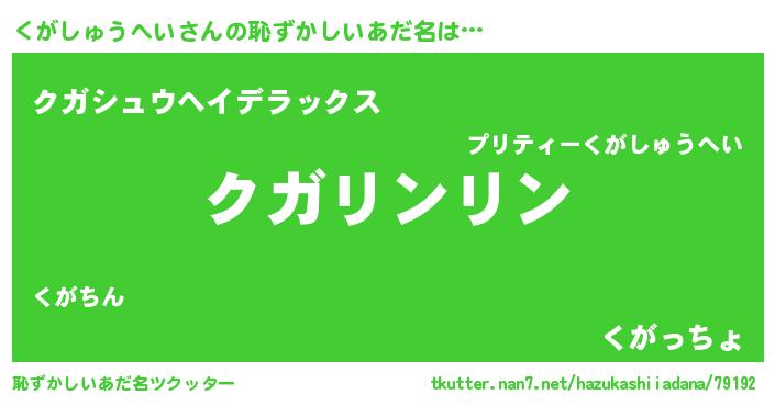 | 男性向けラノベタイトル風あだ名 | 『くがしゅうへいの嫁は女の子じゃないと思った?』 |