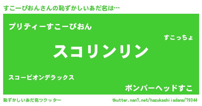 | 男性向けラノベタイトル風あだ名 | 『この素晴らしい世界にすこーぴおんを!』 |