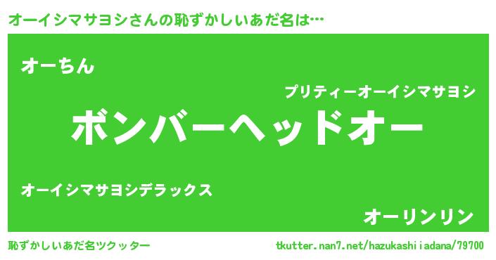 オーイシマサヨシさんの恥ずかしいあだ名は… 『ボンバーヘッドオー』『オーちん』『オーリンリン』 ツクッター #恥ずかしいあだ名ツクッター http://tkutter.nan7.net/hazukashiiadana/79700/
