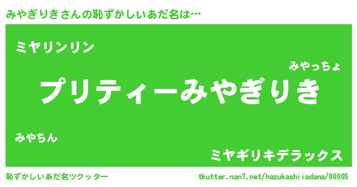 | ヒーロー風カッコイイあだ名 | 『スーパーミヤギリキ』『仮面ミヤダー』 |