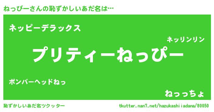 | 男性向けラノベタイトル風あだ名 | 『魔弾の王とねっぴー』『ねっぴーの憂鬱』 |
