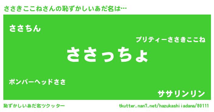 ささきここねさんの恥ずかしいあだ名は… 『ささっちょ』『ささちん』『ササリンリン』 ツクッター #恥ずかしいあだ名ツクッター http://tkutter.nan7.net/hazukashiiadana/80111/