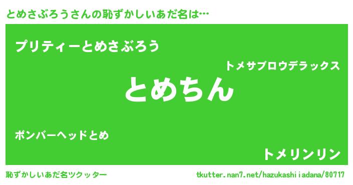 | ヘコむあだ名 | 『とめさぶろう(苦笑)』『とめもー』 |