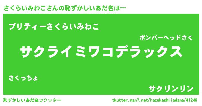 | 女子向けラノベタイトル風あだ名 | 『シンデレラさくらいみわこ家の靴箱館』 |