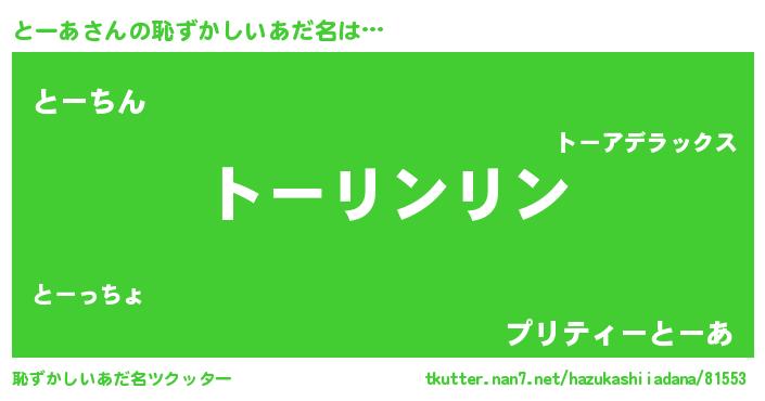 | 意味不明あだ名 | 『とにかく怪しいとーあ』『自称とーあ』 |